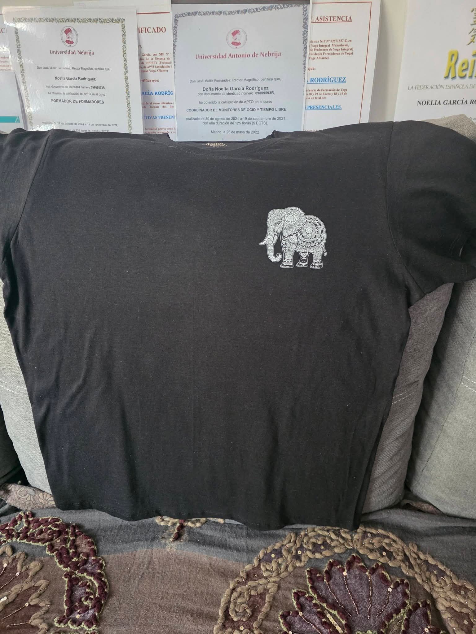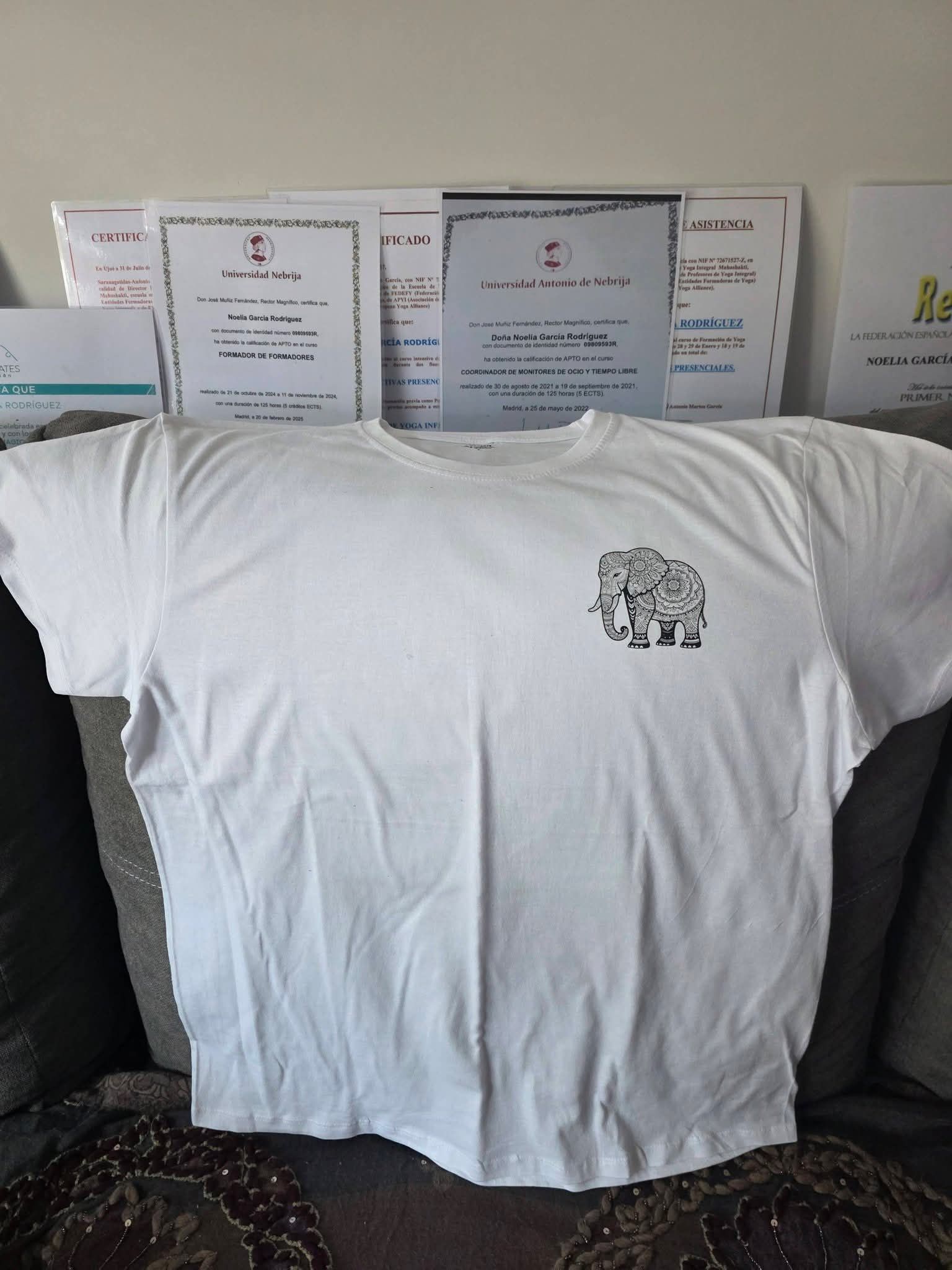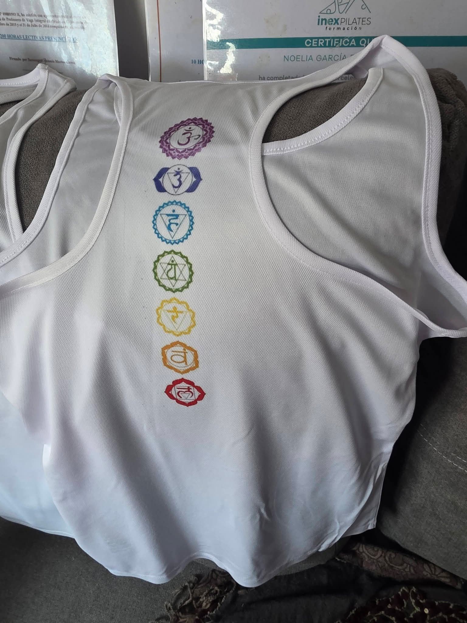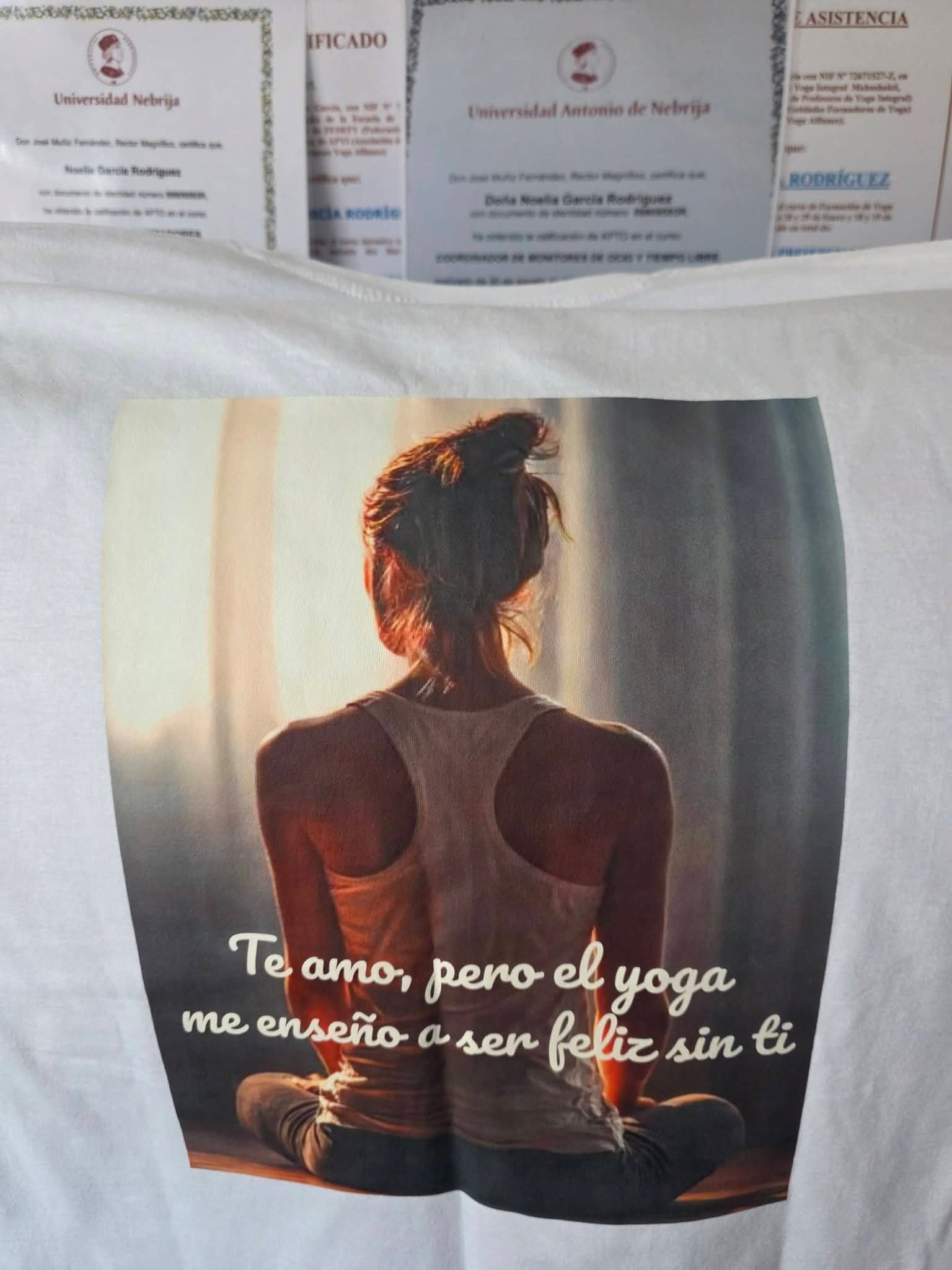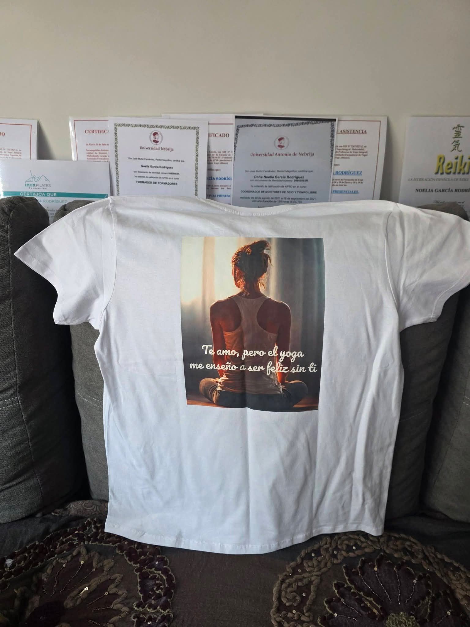 Camisetas hechas y diseñadas a mano con motivos especiales de yoga y energía.